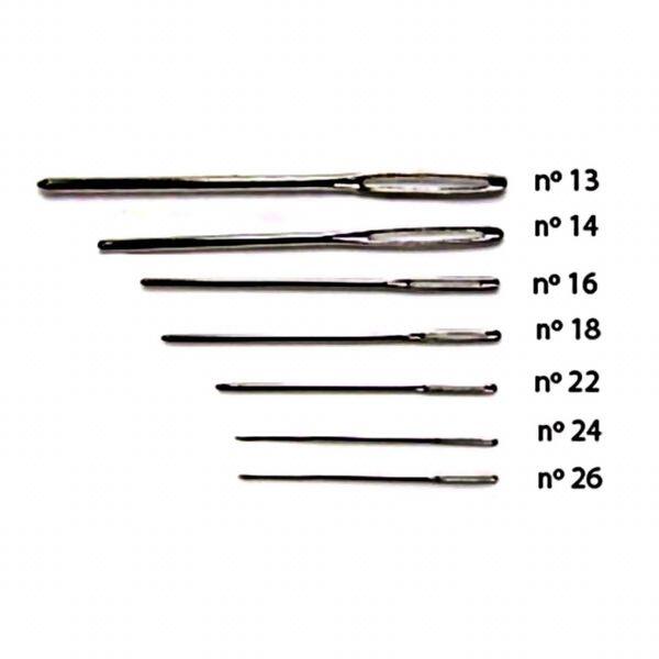 Agulhas Tapestry de aço niquelado, para bordar tecidos de fios contáveis. Possuem ponta arredondada e olho lardo, ideal também para o acabamento em peças de tricô e crochê. Disponível nos números 13, 22, 24 e 26.