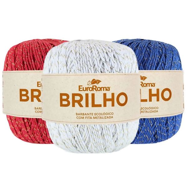 O Barbante EuroRoma Brilho é um barbante idel para vários segmentos de peças de decoração, como a criação de tapetes, almofadas, mantas e etc. Possui uma espessura de 6 fios e têm em sua composição uma fita metalizada de ouro, garantindo um toque único no artesanato. Grande parte de sua composição (95%) origina-se de matéria-prima reciclada.