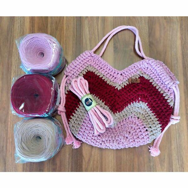 - Kit contendo 3 novelos de 500g de fios de malha premium, espessura 25mm, nas cores Rosa Chá*, Nude e Vinho; 1 corda de algodão com 3 metros na cor Rosa Chá para a alça; etiqueta em couro com o nome "GUYÁ"; e cartão com QRCode para acesso à vídeo-aula da Mari Barbosa, ensinando a fazer a exclusiva Bolsa Guyá.