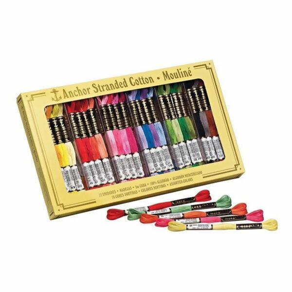 O sortimento Anchor Mouliné possui 72 meadas de 8m em cores sortidas. A meada Anchor é a mais versátil linha de bordar, feita com o melhor algodão do mundo. A linha é super brilhante e muito macia, própria para o vagonite, ponto reto, ponto cheio, bordado livre e especialmente para o ponto cruz. No bordado podem ser utilizados de 1 a 6 fios, dependendo do tecido utilizado. A extensa gama de 402 cores é de encher os olhos de todos os amantes do bordado.
