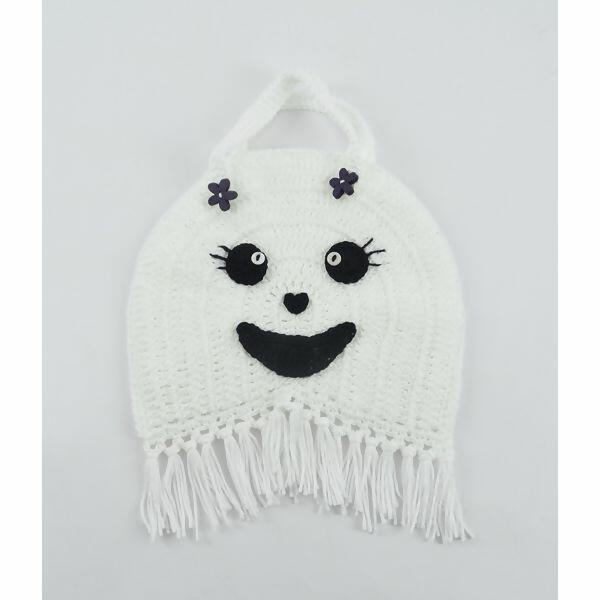 Com o fio branco faça no fundo (parte reta) e nas laterais da bolsa uma carr. em p. b. para fechar a bolsa. Deixe para a abertura na parte arredondada 12 cm sem fechar. Com o fio branco faça a toda volta da abertura uma carr. em p. b. e rem.. Costure os olhos, o nariz e a boca em um dos lados da bolsa seguindo o esquema de montagem. Costure as alças uma de cada lado da bolsa seguindo o esquema de montagem. Pregue o botão branco no olho (ver foto). No lado onde está a carinha pregue um botão de flor em cada alça (ver foto). Faça com o fio branco franjas em crochê com 4 fios dobrados ao meio e 5 cm de comprimento cada franja pronta.