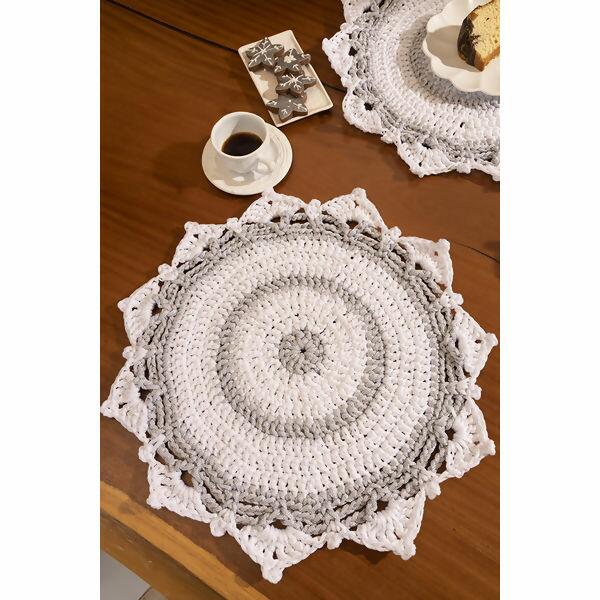 2ª carr.: emende o fio Branco, inicie com 3 corr. 1 p.a. no mesmo p. de base, * 2 p.a. no mesmo p. de base, * rep. de *a* mais (10x). Feche com p.b.x.