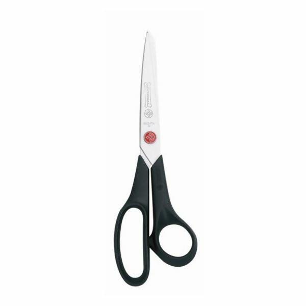 As tesouras Ponto Vermelho possuem lâminas de aço inoxidável e cabos desenvolvidos em polipropileno preto que evitam o deslizamento. Todas as tesouras dessa linha têm um parafuso ajustável protegido pelo logo da Mundial: o ponto vermelho.