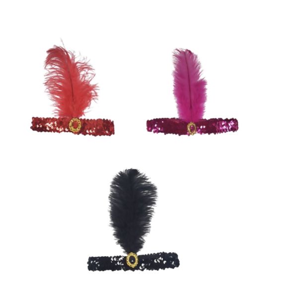 Tiara de elástico com paetê, pedra e pena;